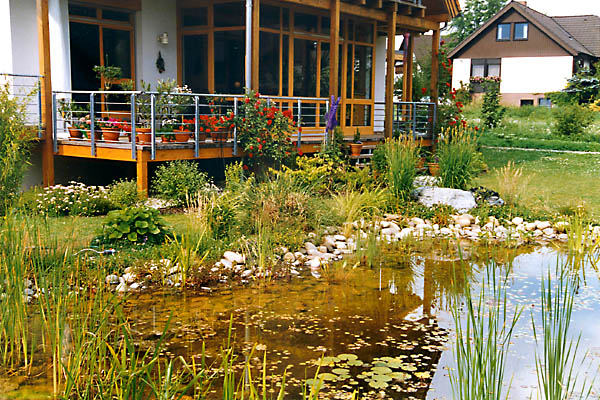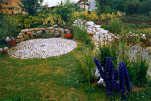 Als Gartenelemente waren eine Teichanlage mit natürlicher Wasserkaskade geplant sowie ein Sitzplatz, eingerahmt mit einer