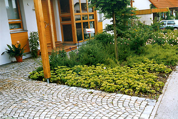 Die Wege und Stellplätze wurden mit Granitpflaster in der Größe 8/10 und 15/17 cm gepflastert.